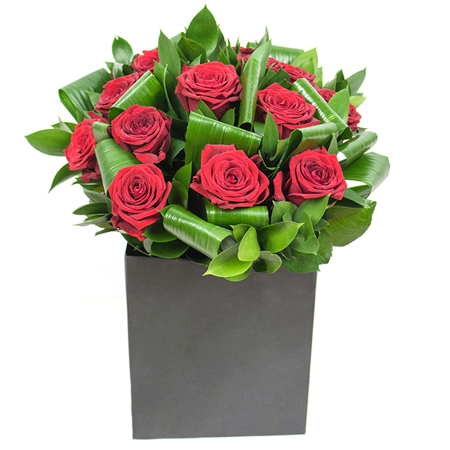 Enhance your home with our stunning red rose flower arrangement. Featuring vibrant red roses paired with elegant aspidistra leaves and lush ruscus, this bouquet is a perfect blend of color and sophistication.
