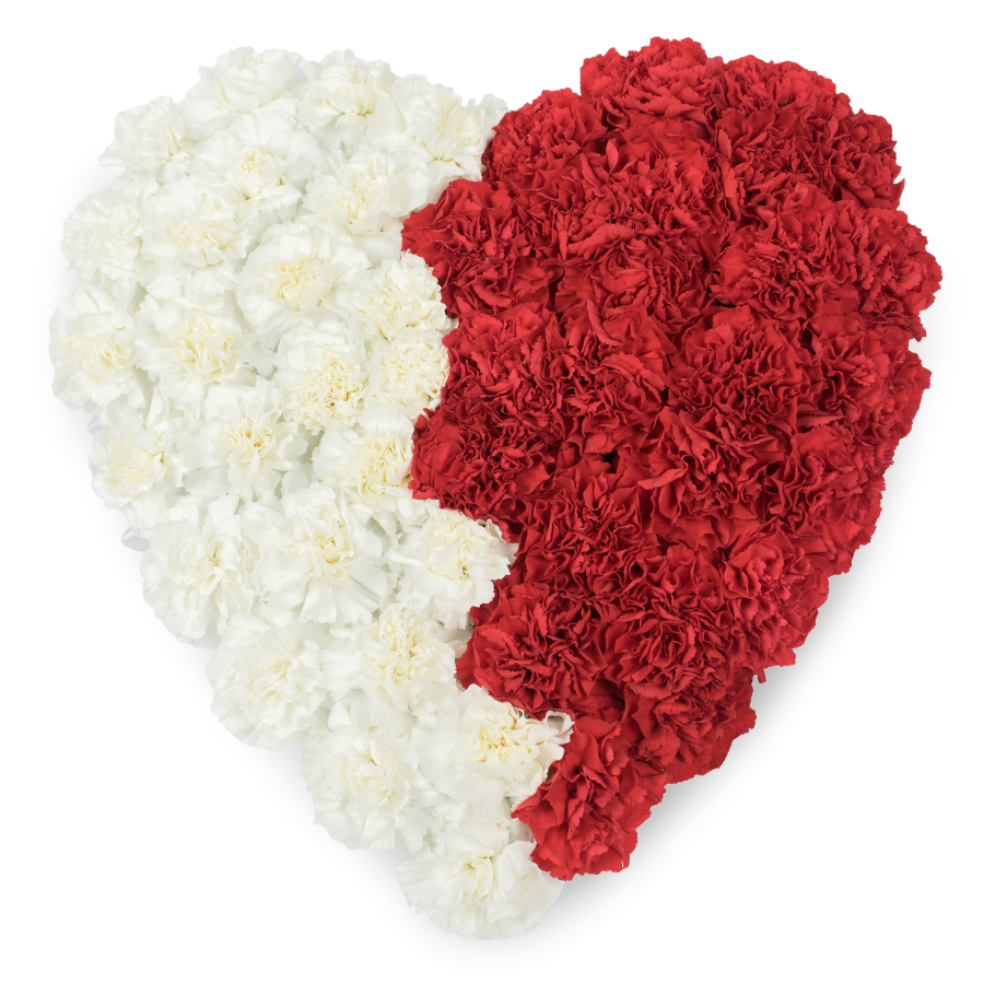 Indulge in the exquisite beauty of our Mixed Carnations Heart Arrangement. This unique bouquet dazzles with a vibrant mix of white and red carnations, expertly combined to create a stunning heart-shaped display that captures attention and warms hearts.